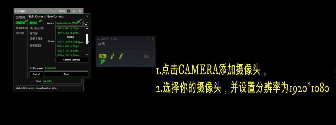 点击CAMERA添加摄像头,按照图中箭头所示,选择摄像头和选择摄像头分辨率。