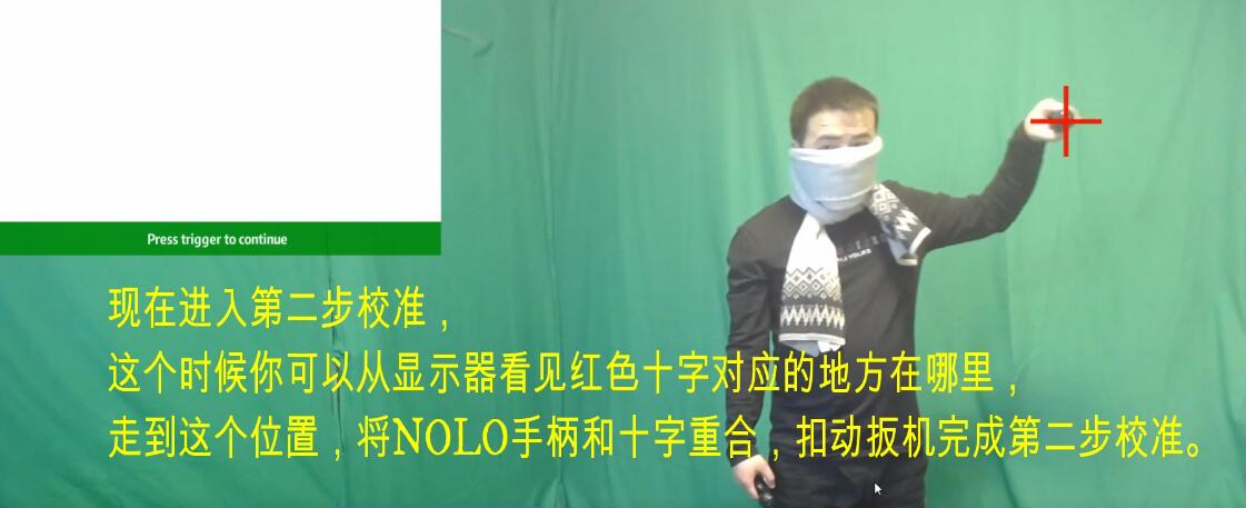 第二步校准,你会看见第二个十字所在的地方,走到这个地方,将NOLO手柄顶部定位球和十字重合扣动扳机完成校准。