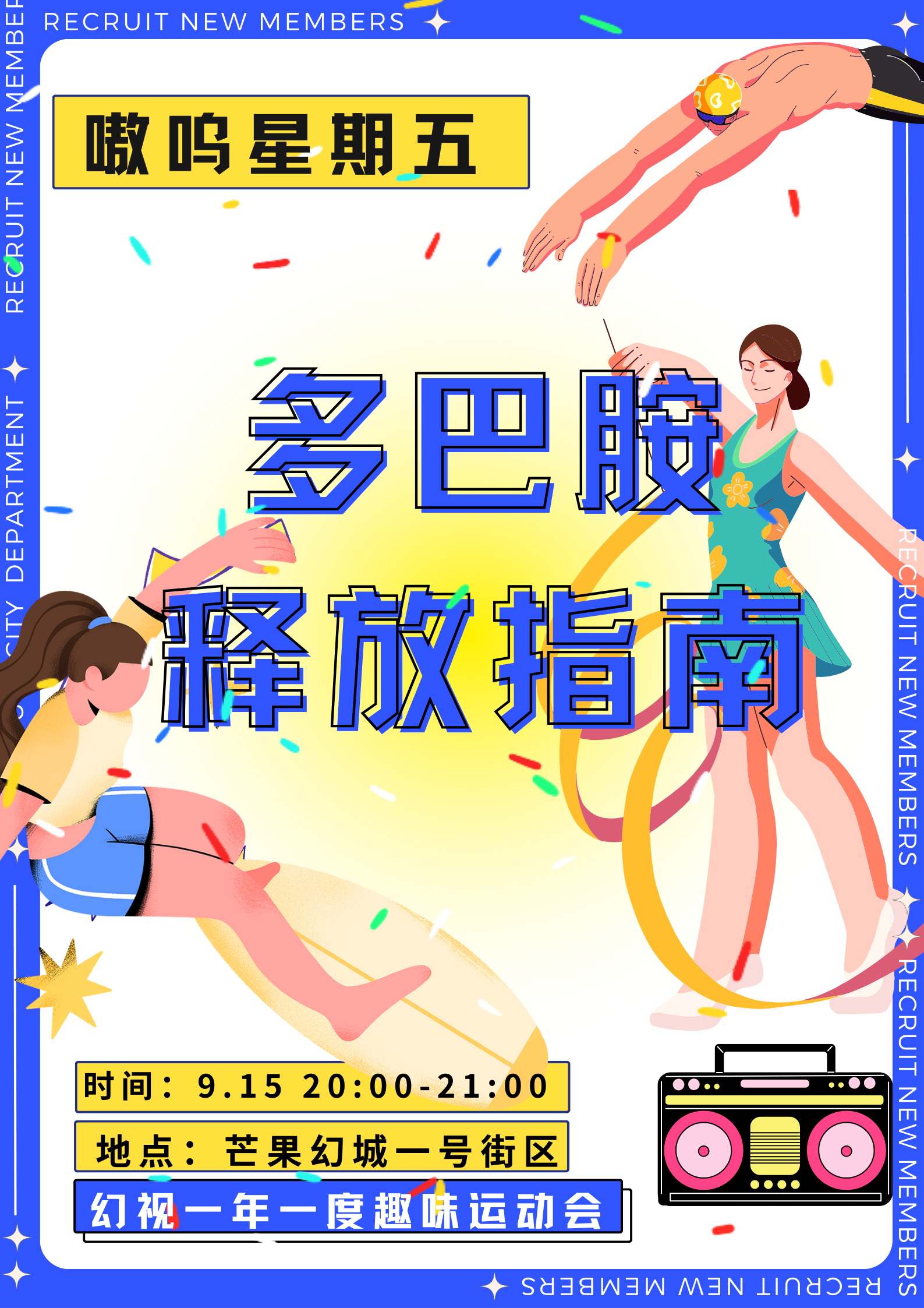 ??《嗷呜!星期五》 准时报道? 各位幻城的居民们, 这个星期你们是怎么度过的呢! (躺在沙发休息还是出门呼吸新鲜空气了呢? 周五啦,让我们一起扫掉一周的烦恼,一起动起来吧!) 这里有一份关于运动的小知识等待你的查收 【9月15日周五晚八点】 芒果幻城一号街区秀场 我们一起去寻找“多巴胺释放指南”吧!