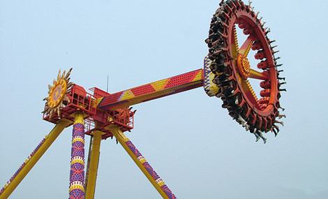 戴上头盔之后,游戏里的场景做的还是很逼真的,高精度的还原了游乐场坐上大摆锤能看到的景色,但是不得不说,进入游戏后。。。。。恐高的还是恐高~~~也能让你体验到突然从地底下升上高空的感觉~~