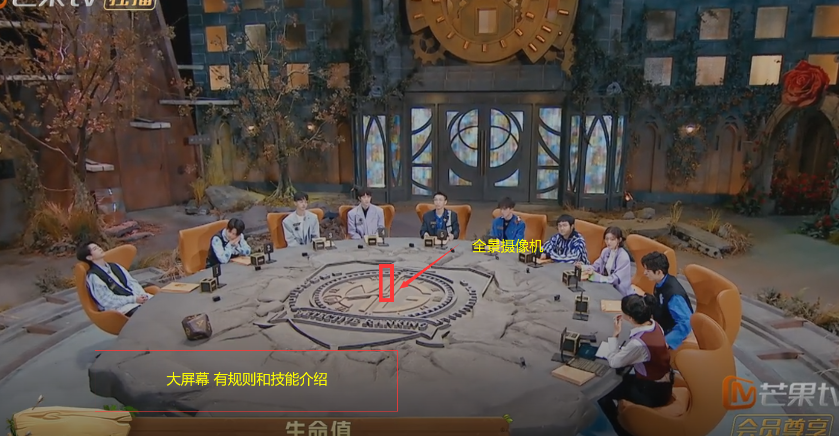 每个人的旁边或者大屏幕里可以配有电子的显示每个人手牌(捕食卡和技能)显示牌,或者是采访的镜头。
