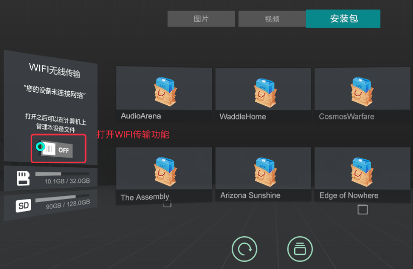 在Pico Neo中,点击Launcher下方的“全部”分类,选择其中的“文件管理”应用,打开左侧WIFI传输开关,如下图: