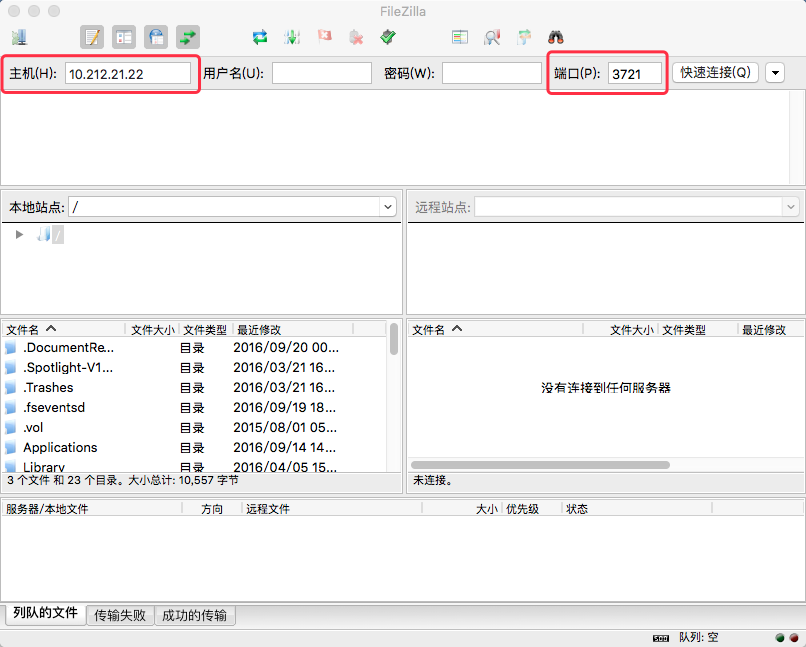 下载FileZilla并安装,打开之后在主机和端口中分别填入ftp地址参数,点击“快速连接“。Mac版FileZilla软件可以在帖子最下方下载链接中找到。