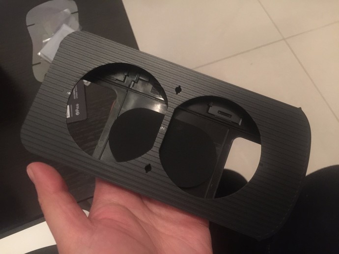 4、把手机放入下面这张图的塑料盒子里面,然后插入头盔中,通过头盔中看到的内容进行操作。