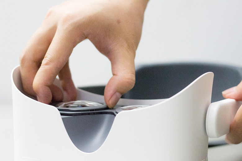 正面是一个镀铬的金属进风格栅,里面是一个吸气的风扇,我开性能模式,风扇狂吹,鼻子这里居然是出气口,有风吹进来,高明的设计,可以给脸部散热。