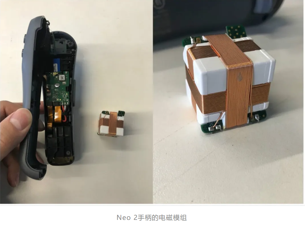 这个就是手柄内部的电磁模组,也是为什么那么重的原因。NEO 2头盔也是用这个定位手柄的。工作原理就是由这个电磁模组生存一个磁场,头盔接收磁场,加上手柄的陀螺仪算法,最终定位手柄。效果就是手柄可以360度的6DOF定位,而且离头越近,精度越高,相对的,手柄之间可能会越近越不准。电磁模组就是个铜线包铁的东西,所以很重,也很耗电,所以使用内部锂电池,更重了。