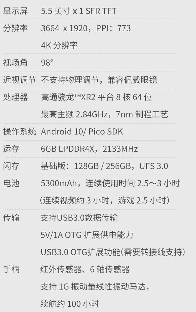 测试前,先来看看Pico Neo 3的硬件配置,这配置对VR一体机来说,绝对是第一梯队的。