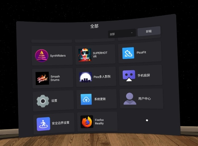系统栏——菜单栏底部还有一个系统栏,包括时间、电量、左右手柄、安全区、WIFI、蓝牙、设置,最右边是登录账号,第一次进入系统都会提示注册和登录Pico账号,这里要注意,一旦登录账号表示设备已经成功激活,就不支持七天无理由退货了。