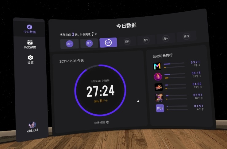 运动中心——这个值得说一下,因为毕竟买一体机的其中一个目的就是在家运动健身。这里我们可以设定每天运动的目标,我设的是30分钟,因为打卡也是需要30分钟。通过VR运动(摇手柄)的时候,运动时间就会往上加,我一般每天打卡前可以先看看有没有达到30分钟,达到了再去打卡。