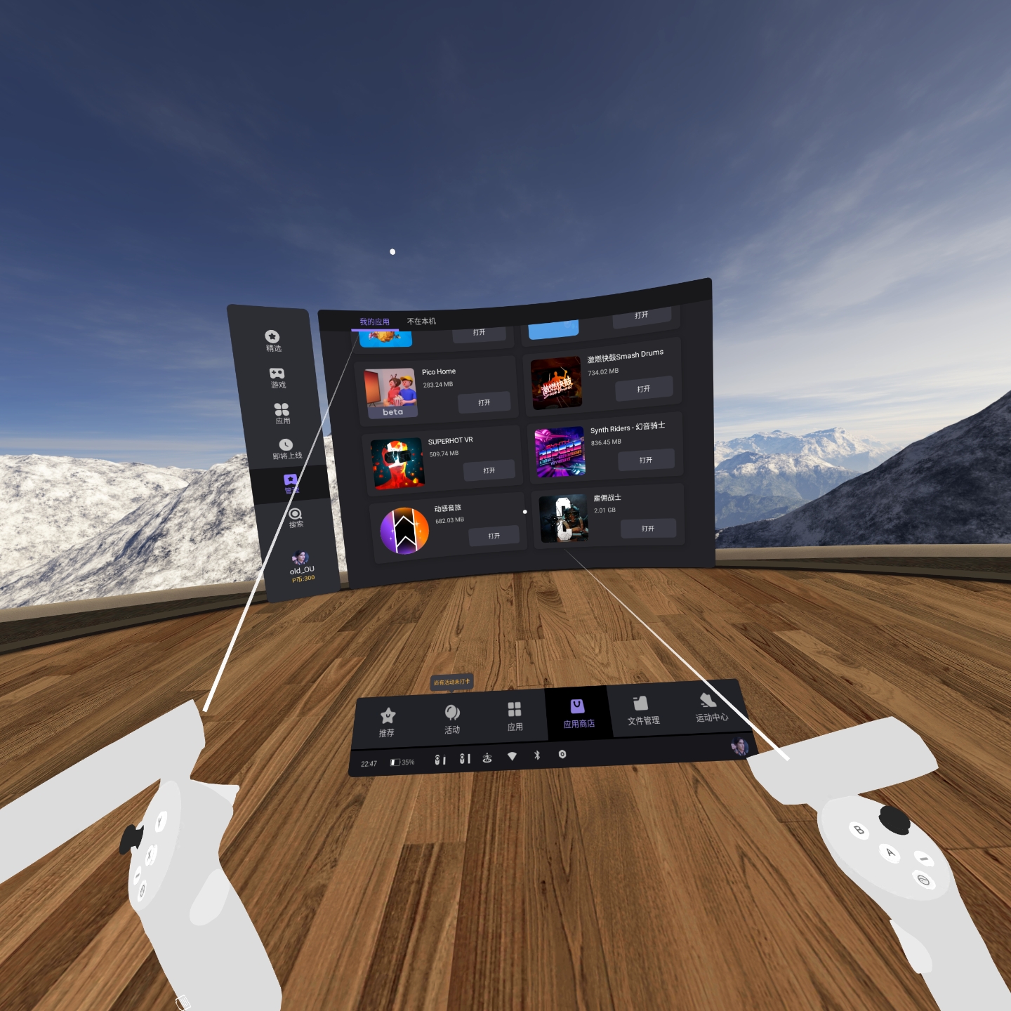 太空舱正对我们面前的就是PUI的界面,使用手柄移动光标可以进行操作。可以看到,PUI底部的菜单栏主要分为推荐、活动、应用、应用商店、文件管理、运动中心几个栏目。