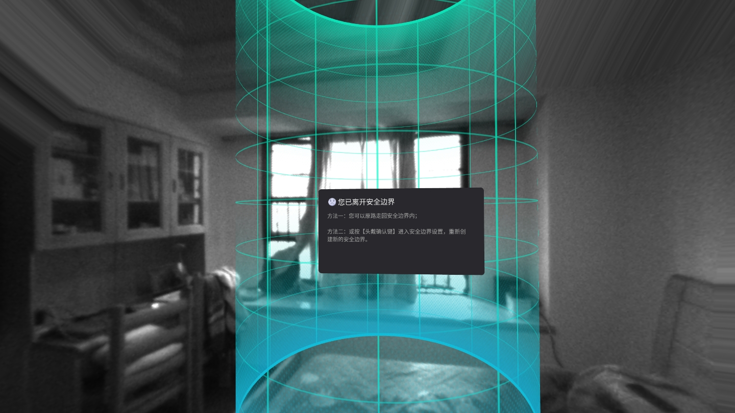 当我们在玩一体机的时候,如果接近或者超出安全区的边界,就会看到一个安全区的范围显示,在安全区外面时可以直接看到外面的实景,避免我们碰撞,如果需要重新定位安全区,按头盔上的确定键即可。