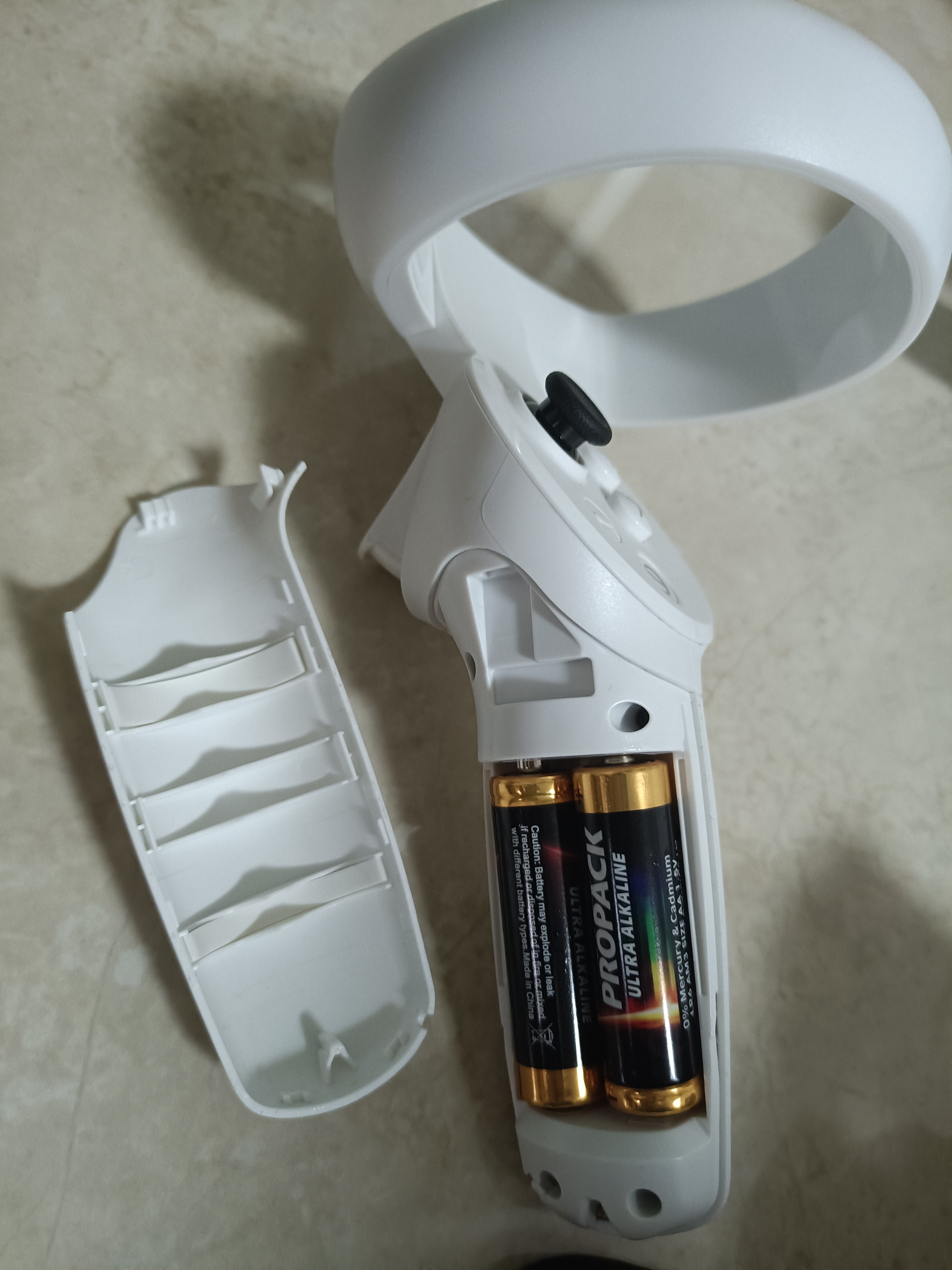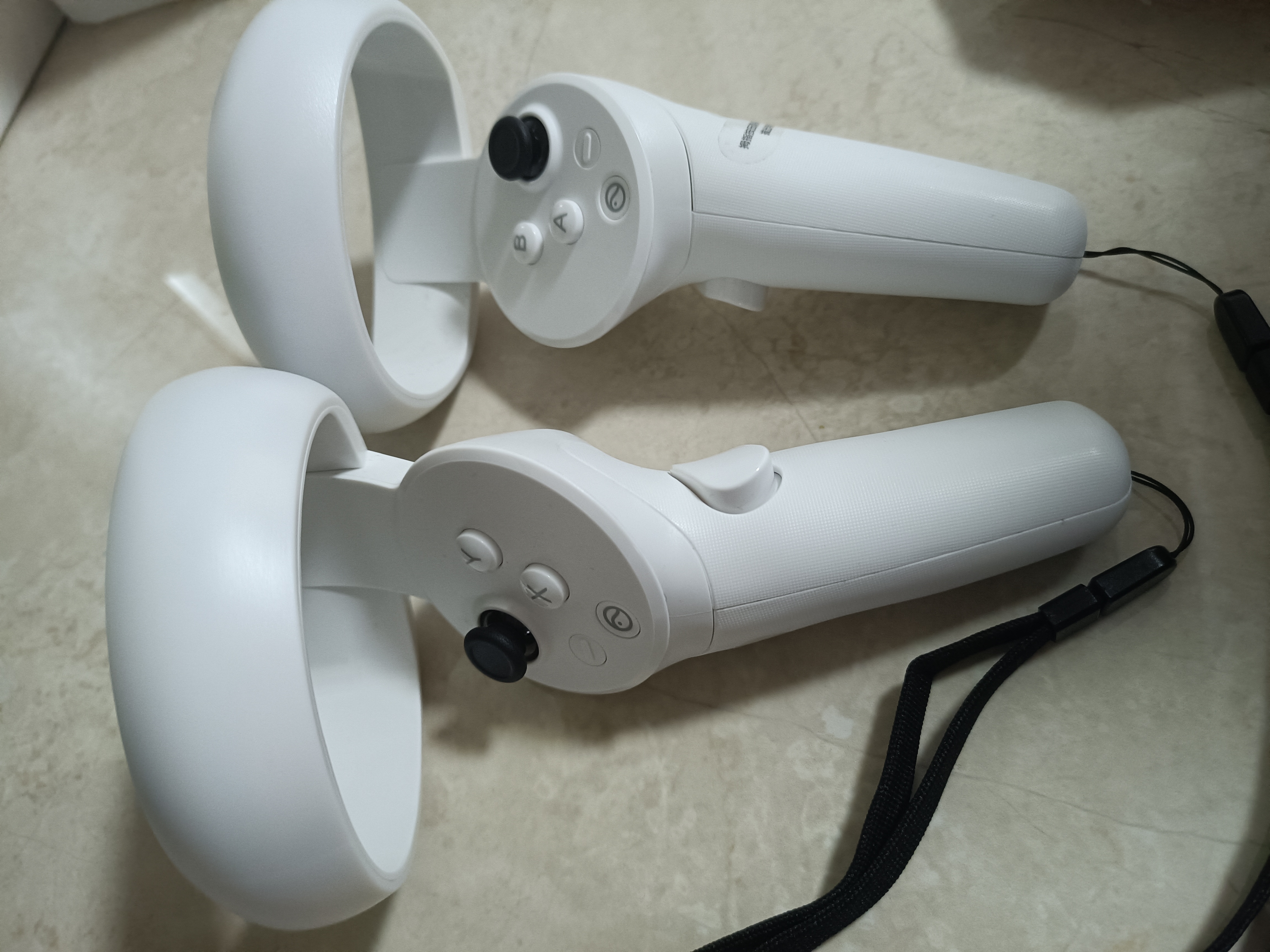 手柄是纯白色的设计,左右手各一个。手持的部分正面有摇杆、返回键、Home键、A、B、X、Y键,前方是扳机键、侧面还有侧边键,摇杆上方是一个圆环,用于定位追踪。每个手柄使用两节5号电池供电,避免了充电的麻烦。另外,也可以安装上手柄挂绳,玩游戏的时候穿在手上可以防止手柄飞出去。