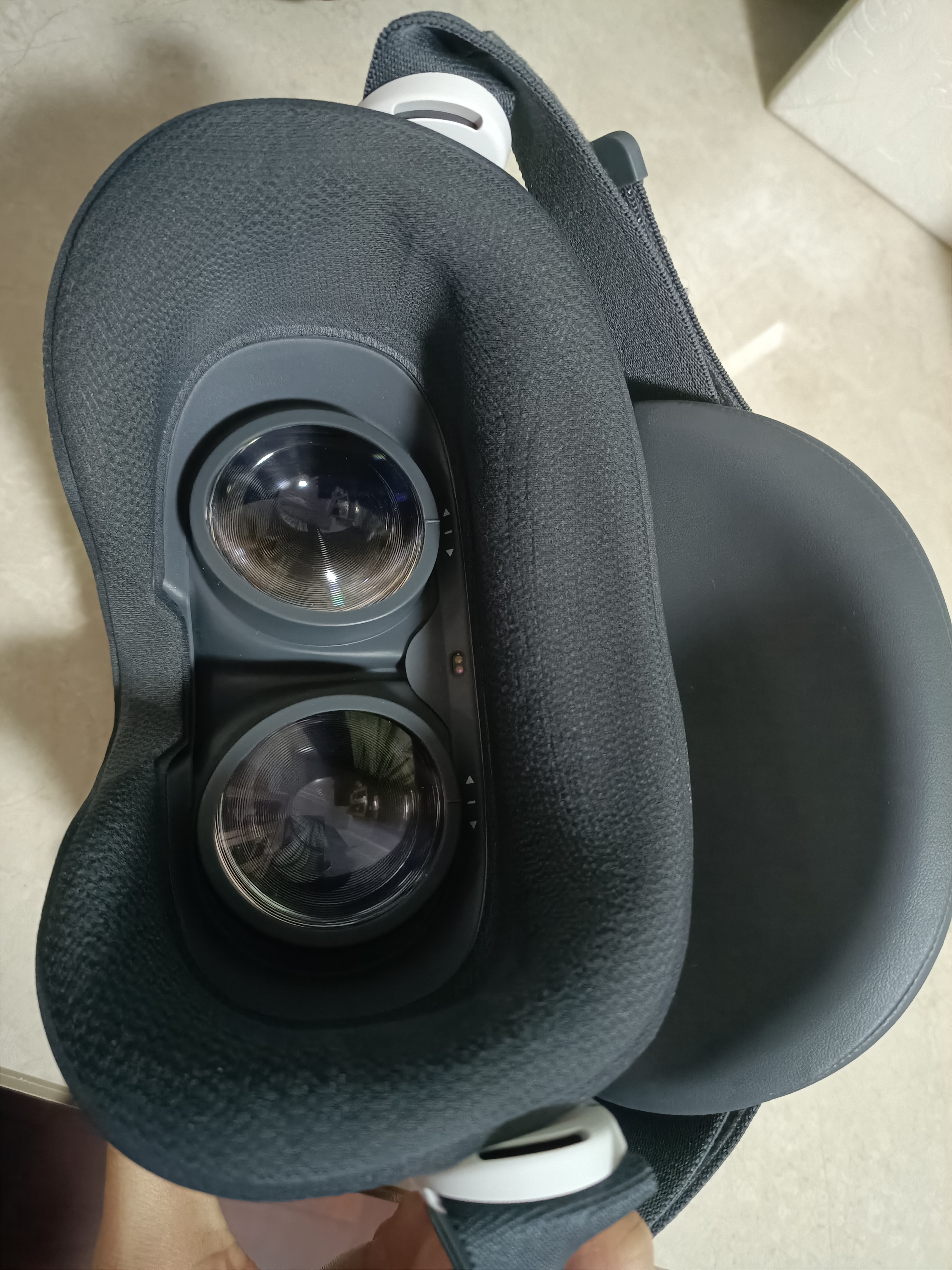 再看看镜头这边,两个大大的圆形玻璃镜片,支持三档的瞳距调节。由于VR镜头特殊的成像原理,即使近距离观看也不用担心影响视力,当然这个镜头是不包含度数的,近视的朋友就需要额外戴上自己眼镜来观看了。镜头前面还有一大块软软的泡棉,用来提升贴面的舒适感。对于近视的朋友,就需要把眼镜支架安装在棉袍和主机之间才能正常使用。