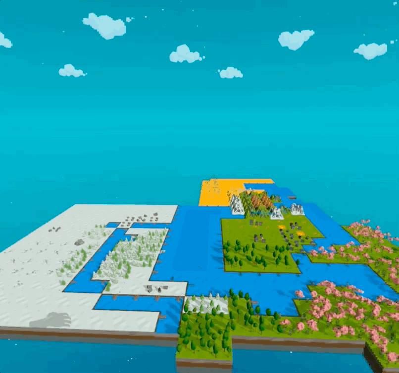 玩家按X键呼出菜单,可以在一片没有任何限制的空间中,选择平原、森林、樱花林、水面、雪地、沙漠、荒漠、火山等等各种地形进行布置。同时也可以在地形之上放置动物、矿物等等。