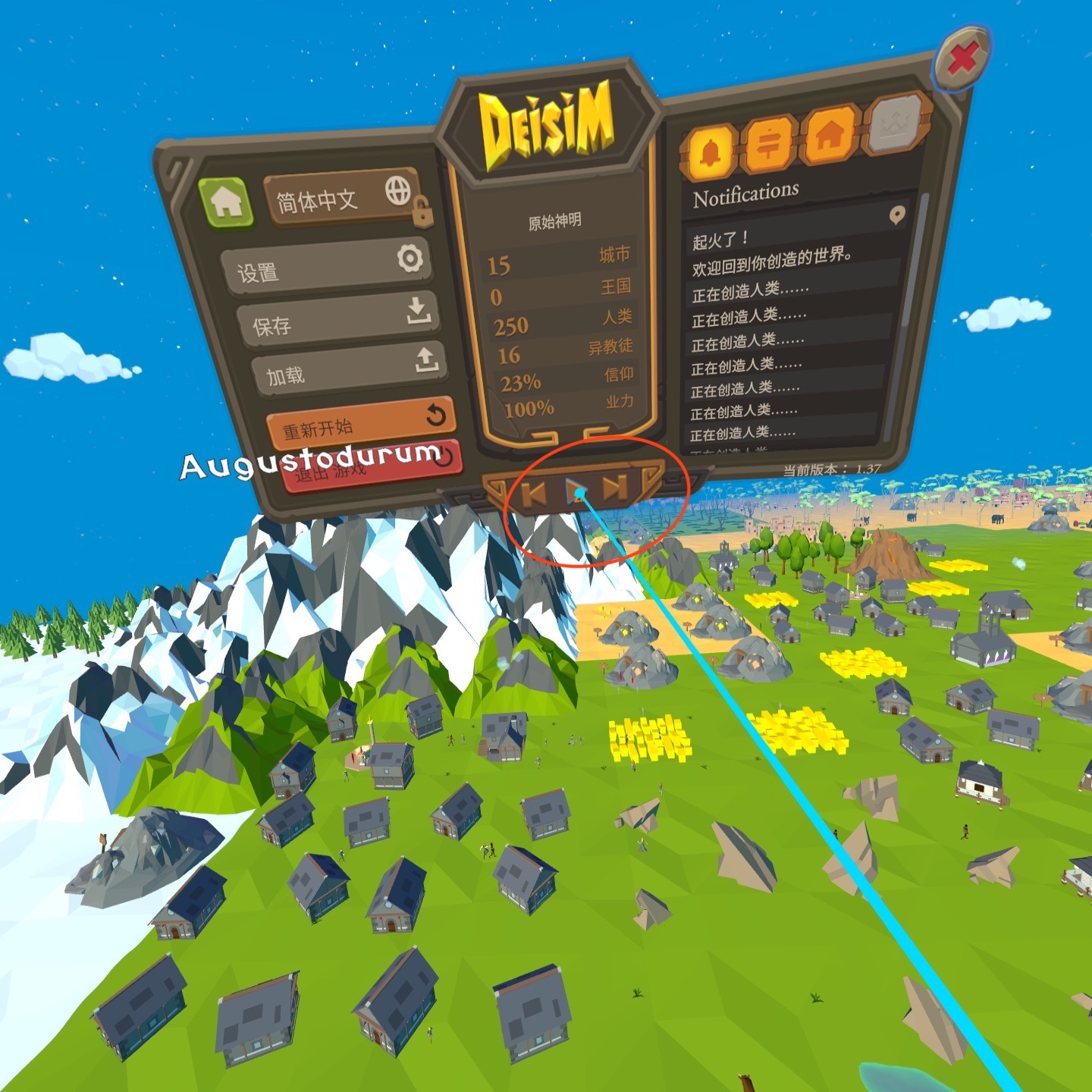 首先跟着教程学习操作按键,A键和X键都可以呼唤出奇迹菜单,Y键可以调整视觉大小(3种效果),B键和"-"键可以主菜单:设置,保存,加载,包括历史消息,文明进展,城市需求都可以在这里看到。还有加快2倍速度()图示圆圈的部分调节,想要进程快一点的玩家可以调成2倍,小人跑起来都更加欢快了哈哈)。