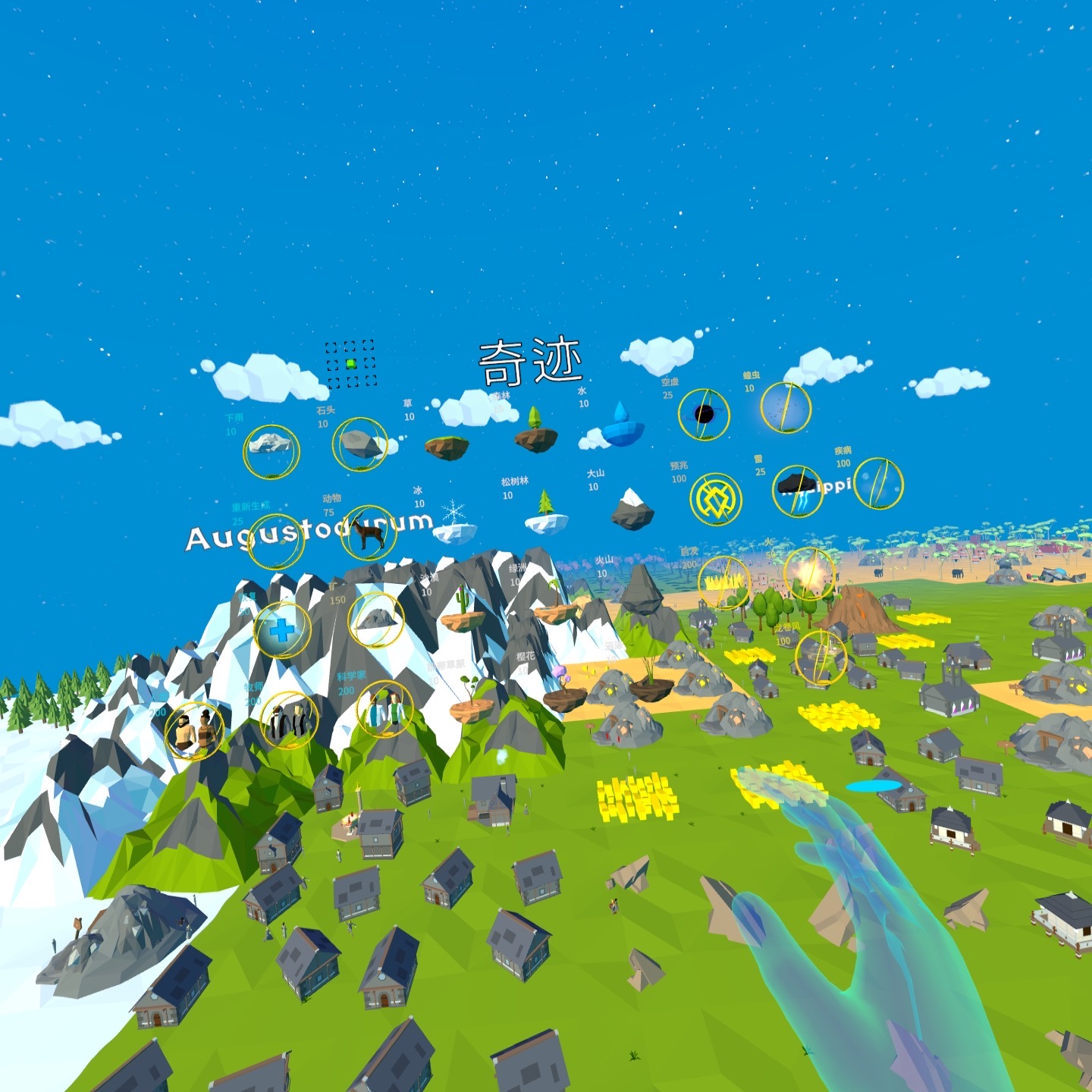 在游戏中你就是全能创世神,俯视着整个世界,创造这个世界就是靠各种奇迹。奇迹对应的图标创造对应的事物,旁边的数字就是所要消耗的法力,当法力不足的时候就不能创造事物,要等法力恢复。法力是在手腕上查看的,左右手上的白色数字就是法力,法力靠信仰会慢慢恢复,上限是1000。