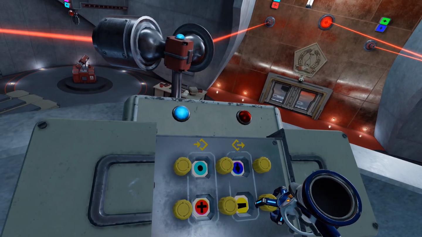 通电之后,将二楼中间的激光对准大门上面的位置,就会有其他激光射出,同过转动按钮,将面板上4个图案分别按照光线进入和光线射出的顺序,对应上对面墙壁上射入的光线的图案和射出位置对应的图案。入和出可以看面板图案上面哪个黄色标记。