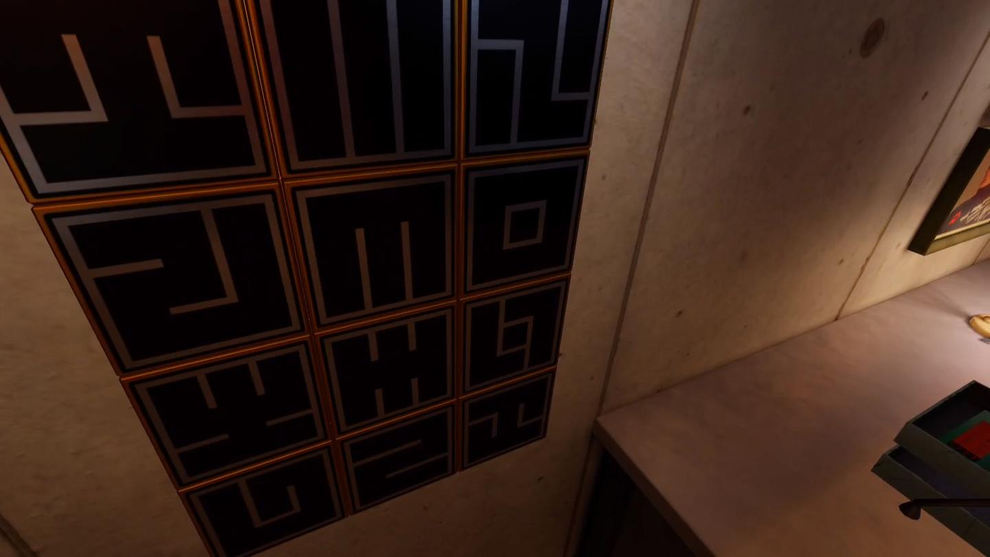 根据安保主管房间镇纸上面绿色点和线条圈出来得三个端点,对应大厅中大型雕塑上面的符号,回到安保主管的方案按照顺序输入墙上的抽象画就可以打开旁边的监控室。