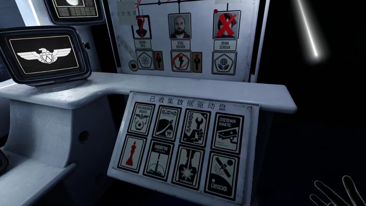 7.第八块磁盘在下一关的通讯室里的桌子上,不瞎能看见。然后先调那个半个大球,是一叮咣一顿转,对上了就亮了,然后去窗户那边,调卫星,卫星两个角度调,跟屋里挂的时钟反着对上就行了。chua的一下 就行了。然后就有人走过来给你一个棋子了。
