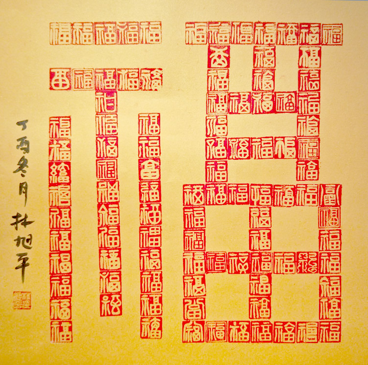 今天晚上将共享最后的20枚福字印章,100枚福字印章该如何使用呢,100枚是不是有些多?作为百枚福印的共享者,想谈点个人建议。当然在印章中选出自己喜爱的样式,作为闲章用于腰章、压脚章等自然是可以的。但更好的应用,我认为将100枚福字印章一起使用,创作属于自己的百福图。下面是几个可参考的实例。 当然,还可以用这100枚福字印制作与自己属相相关的百福图,如百福马图、百福牛图等,定会有趣的很。