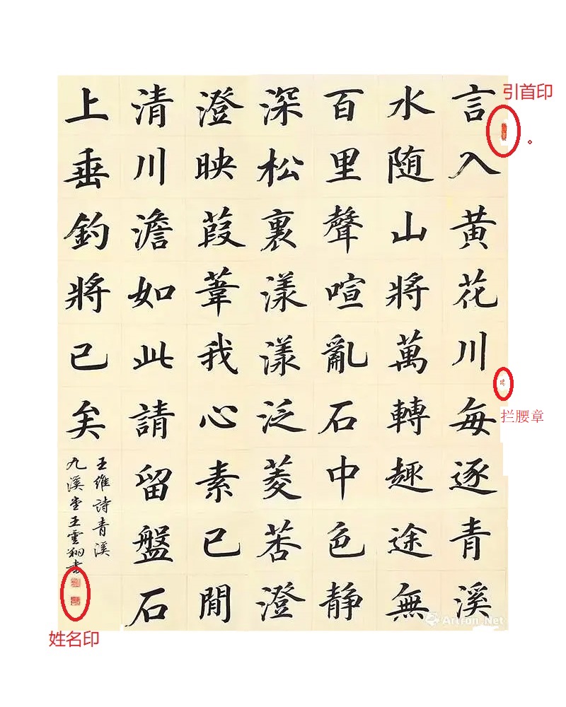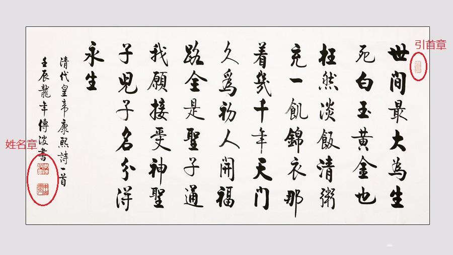 首先应注意印章大小与书法作品字体大小的配合,即大幅的作品钤大印,小幅作品盖小印。具体说,书法作品中的闲章有三类: