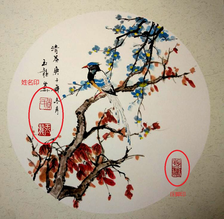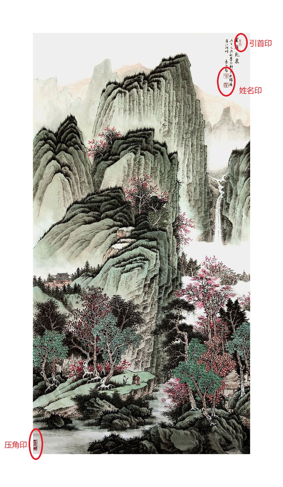 绘画作品上用印大体与书法作品相同,但应注意一般不在绘画中的花头、鸟尾、树枝、山顶处落款盖印。若落款与左上,则可在右下角盖压角印;同理若题款于右上则压脚印盖于左下角。若题款已至作品底边,则不再用压角印。