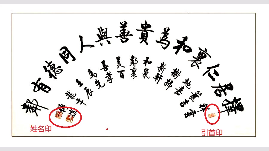 引首章也成为起首章,一般盖在作品开头一二字或三四字中间右侧,起到与落款名章呼应的作用。引首章不宜为正方形,多用随形印,一般以长方形、椭圆形、半圆形、葫芦形等呈长条状的印章为主。引首章可用作者斋馆号、表达志趣的文辞或创作年号等。