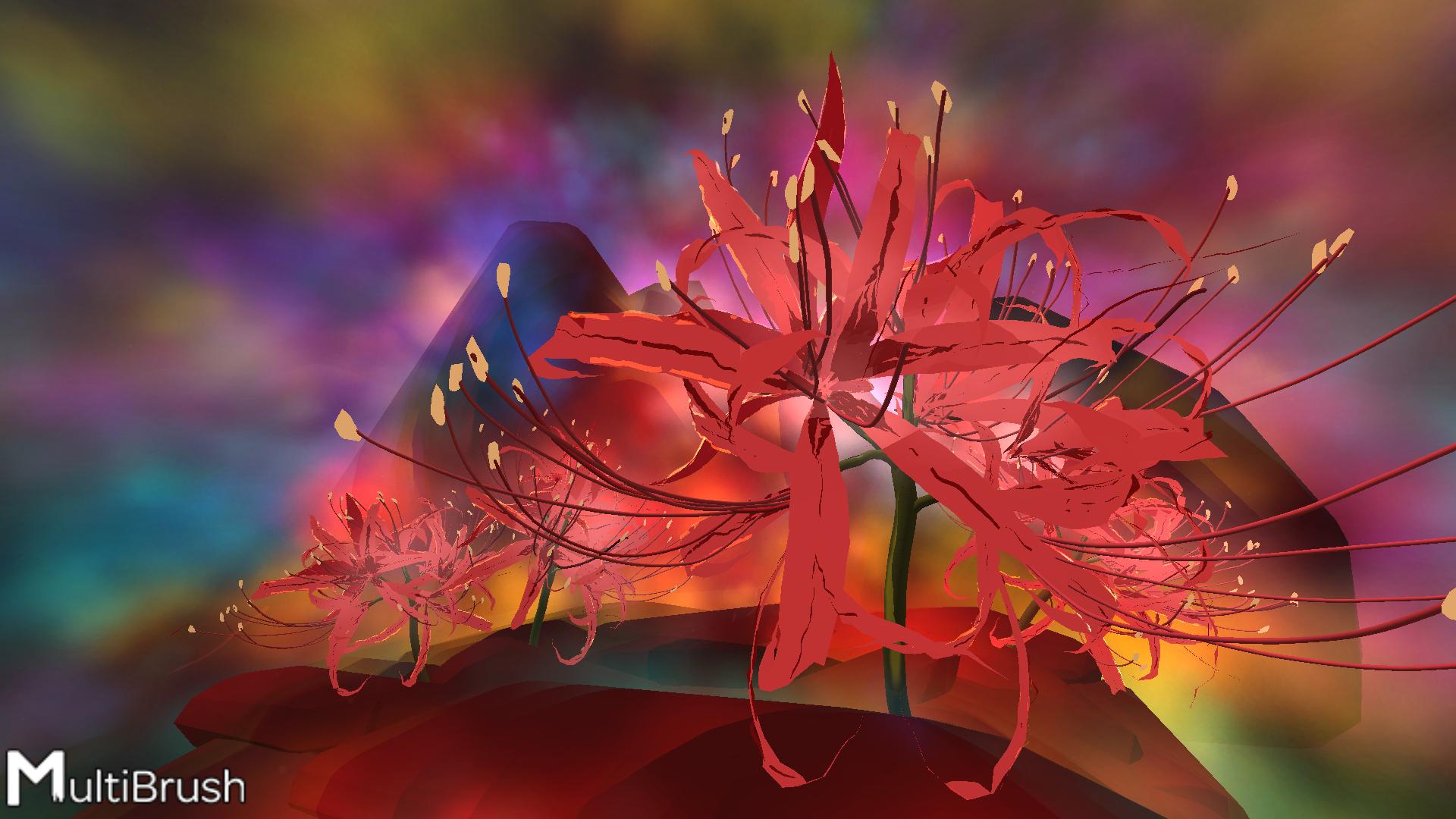 彼岸花……所有回忆都是美好的,铭记不如忘记,未来皆是希望。 开启镜像 花瓣--极细马克笔刷,对称六瓣(绘制花瓣需要快速一笔成型,速度慢会导致断笔) 花心--极细马克笔刷,颜色加深,延伸绘制花茎,天鹅绒笔刷增加花心光影效果 取消镜像 花边(光)--天鹅绒笔刷,不规则显示叶边光影,颜色深浅不同 花蕊--结冰笔刷,无光外壳,全选编组 复制,彼岸花多为五、六支小花一茎 花杆--结冰笔刷,加软高光提升效果 使用烟雾绘制周边环境,花蕊处适量,增加花瓣的自然效果 绘制过程视频