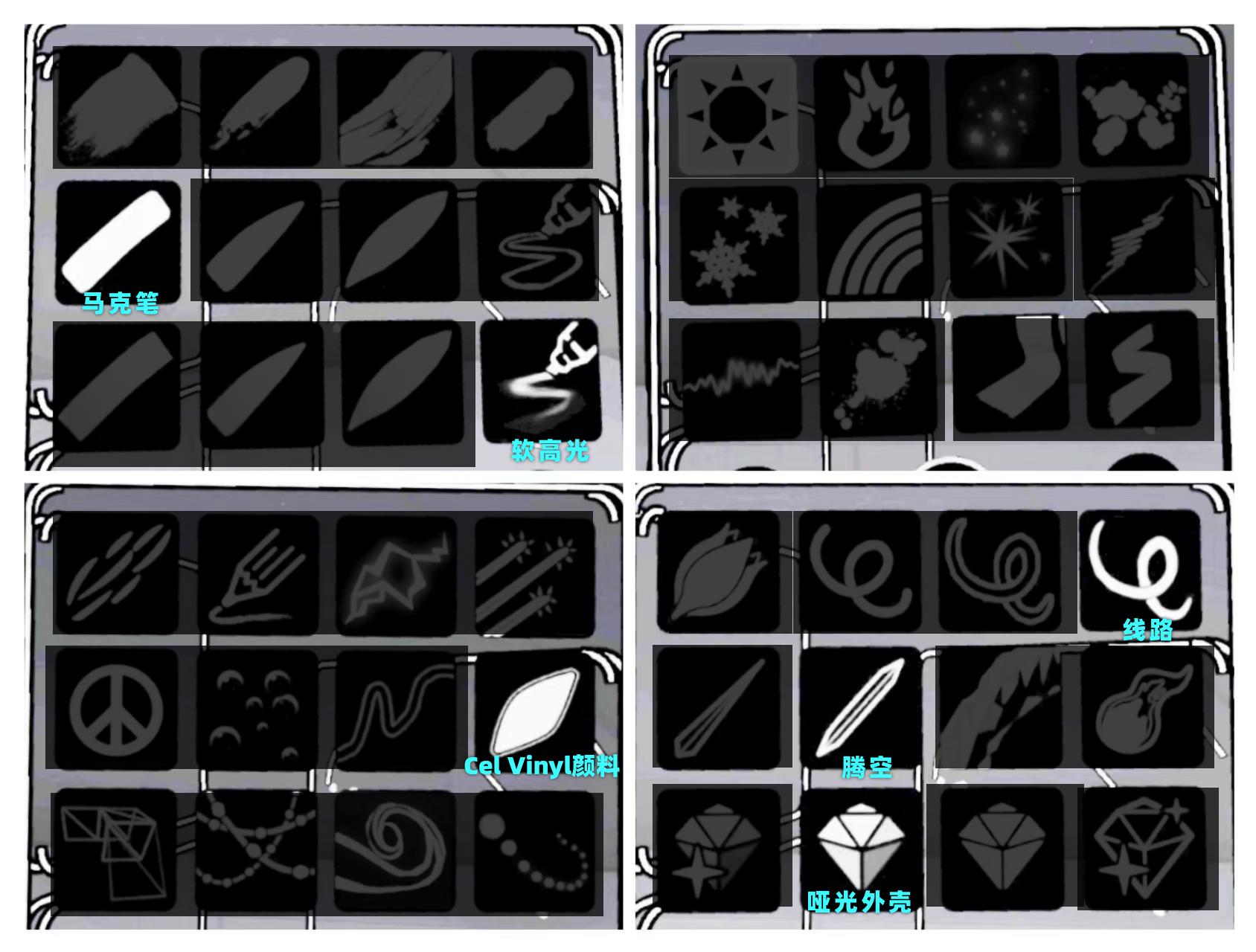 颜色是门大学问,如何选取正确合适的颜色,除了吸取参考图片中的颜色的方法还有就是要锻炼个人对颜色的精准度。颜色的判断需要从大体上看出属于哪种色相,我用的是正方形的选色器,右边是色相,左边方块是选择颜色的明暗。比如说游戏图中的石头和山,这两个物体看上去是灰色的,仔细看再结合整个场景,石头是偏深灰绿的,此时要先选择右边的绿色再在左边选出适合石头的灰绿,还要注意一点的是选择的哑光笔刷的反光,同一种颜色下的不同笔刷画出的颜色和光泽都不同,选颜色还是要注意一下这一块的变化。石头的颜色不是那么明显,需要后期用软高光笔刷进行二次补充亮部。