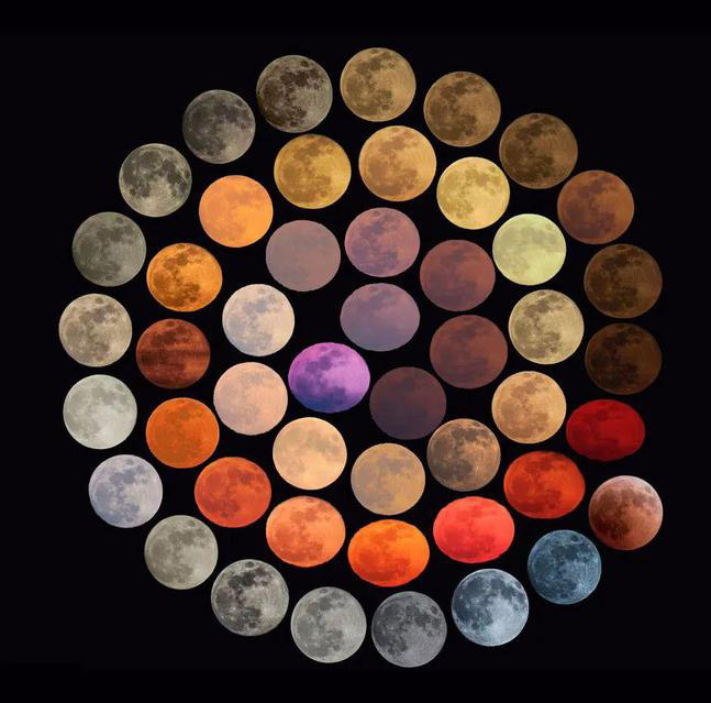 下图是意大利一名天文爱好者,花费10年时间从多个地点记录的满月之色泽。