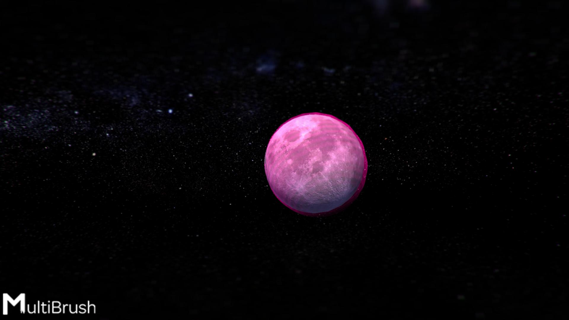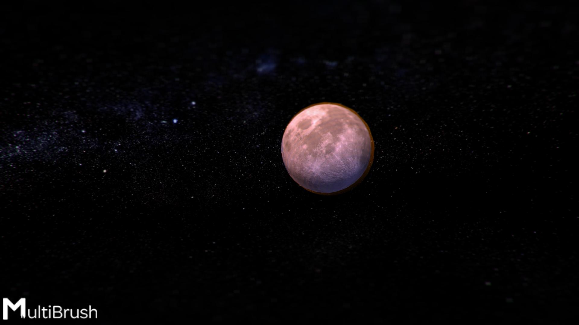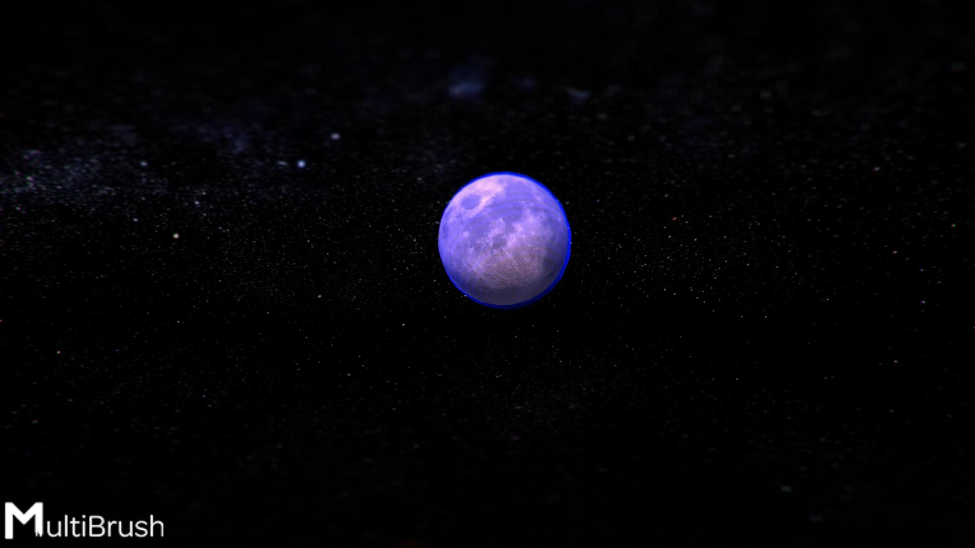 MultiBrush的太空场景中有一个圆圆的月亮,但遗憾的是只有灰白色一种颜色。那么我们如何在MultiBrush中呈现五彩月亮,答案很简单,罩上一个透明的彩色球体就实现了。