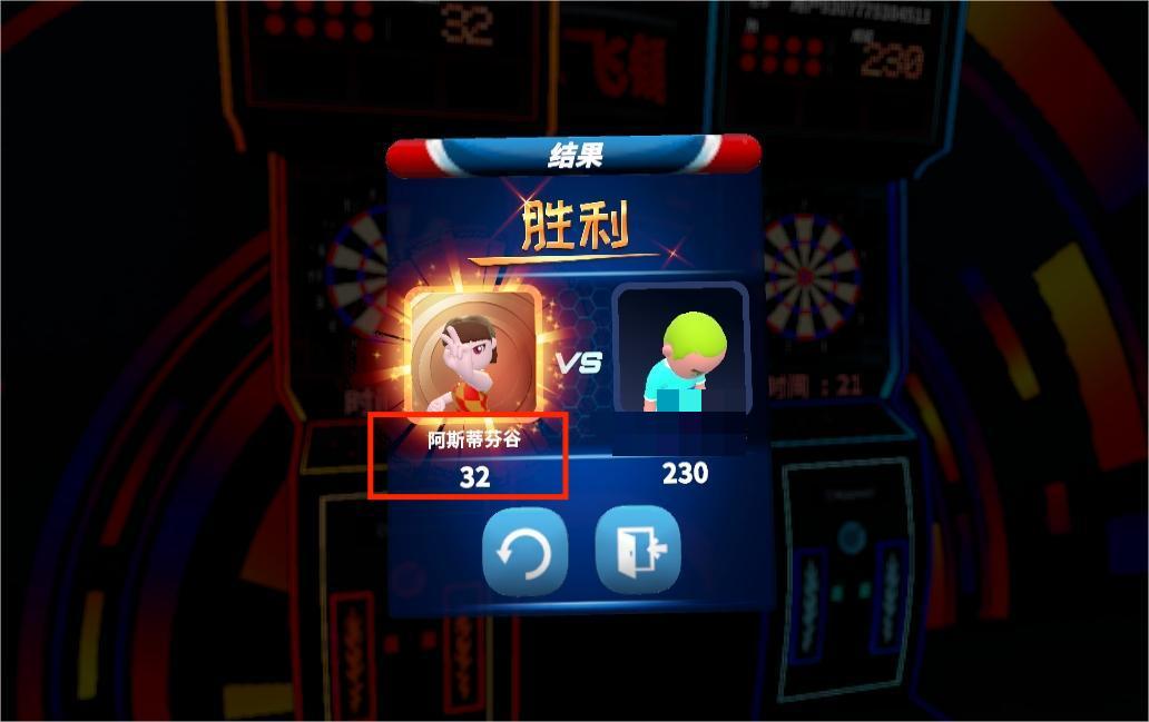 在《多合一运动VR》中,选择“飞镖”并进行随机匹配,任意一次比赛中最终分数不超过 20 且取得胜利即视为完成挑战。截图示例如下所示: