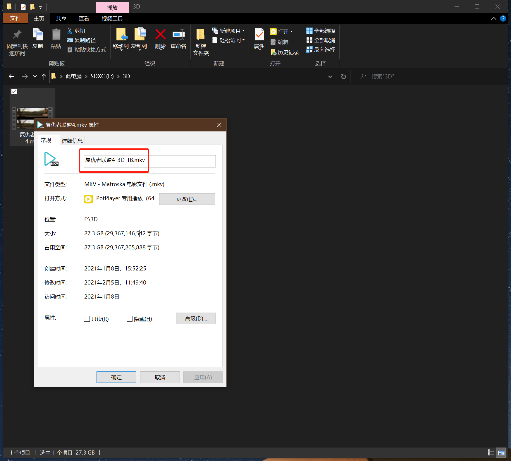 例如在“复仇者联盟4.mkv”的“复仇者联盟4”后加上“_3D_TB”,使之命名为“复仇者联盟4_3D_TB.mkv”。