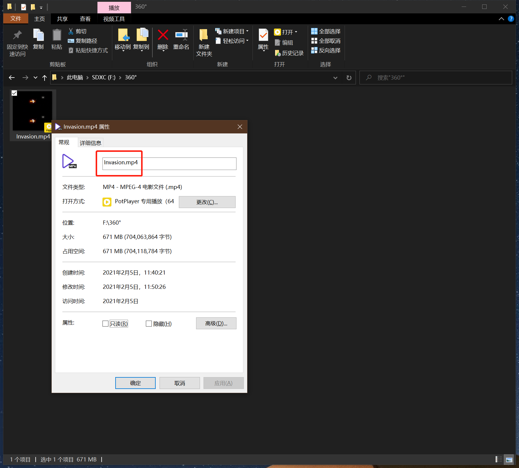 “Invasion.mp4”的“Invasion”后加上“_3D360_TB”,使之命名为“Invasion_3D360_TB.mp4”。