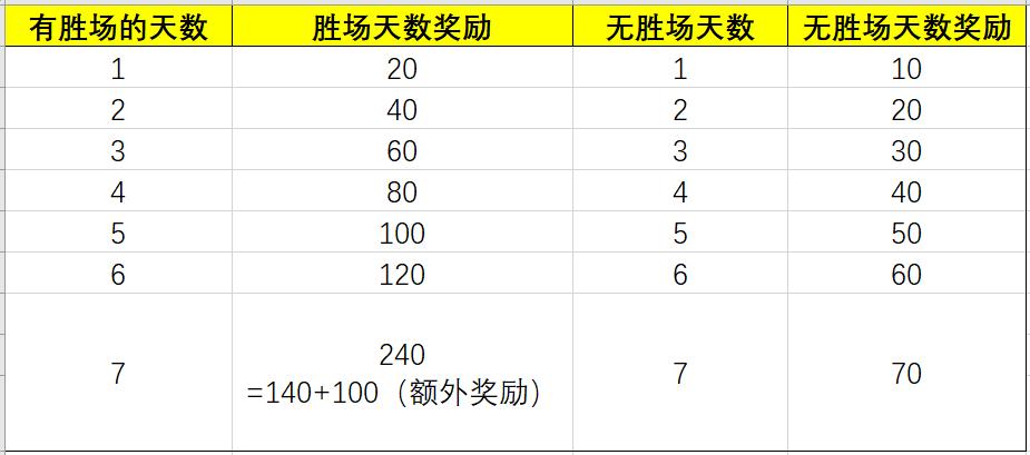 2. 小企鹅同学在第九期积分赛中参加了 7 天,其中7天都有胜场,则总奖励为 240 P 币