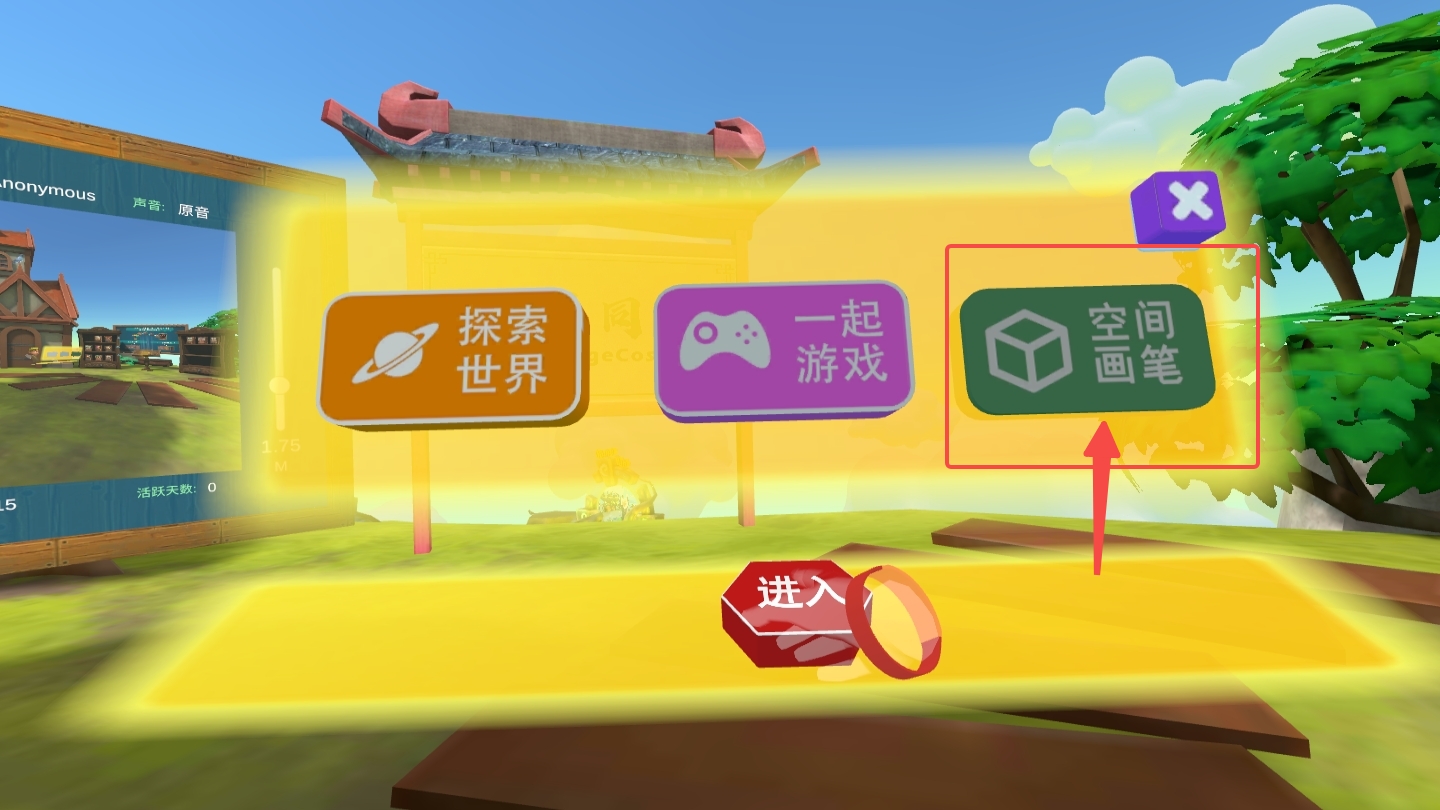 - 进入我的小岛后轻触左手腕的手表,待呼出面板后点击“空间画笔”按钮即可快速进入3D 作画空间进行创作;