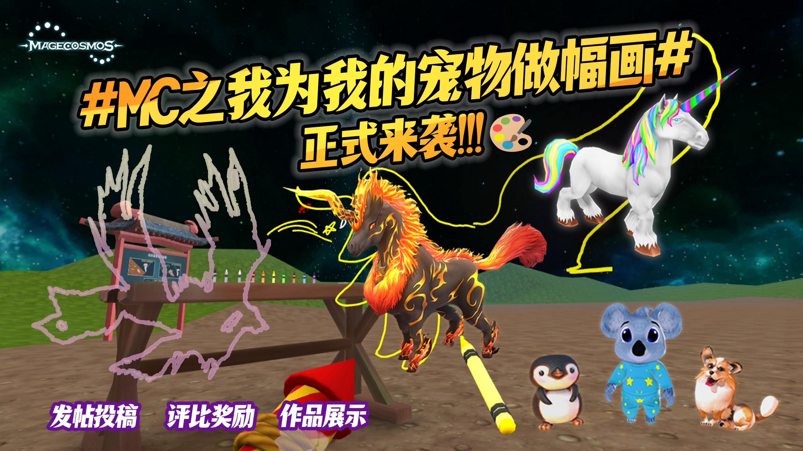 前面几周的你画我猜活动在直播中引起了激烈的讨论和笑点。十月,我们特此推出空间画画比赛!请大家以自己的宠物为原型,使用MageCosmos空间画笔来为自己的宠物画一幅画投稿吧!参与的玩家可以集体瓜分大额红包奖励哦~