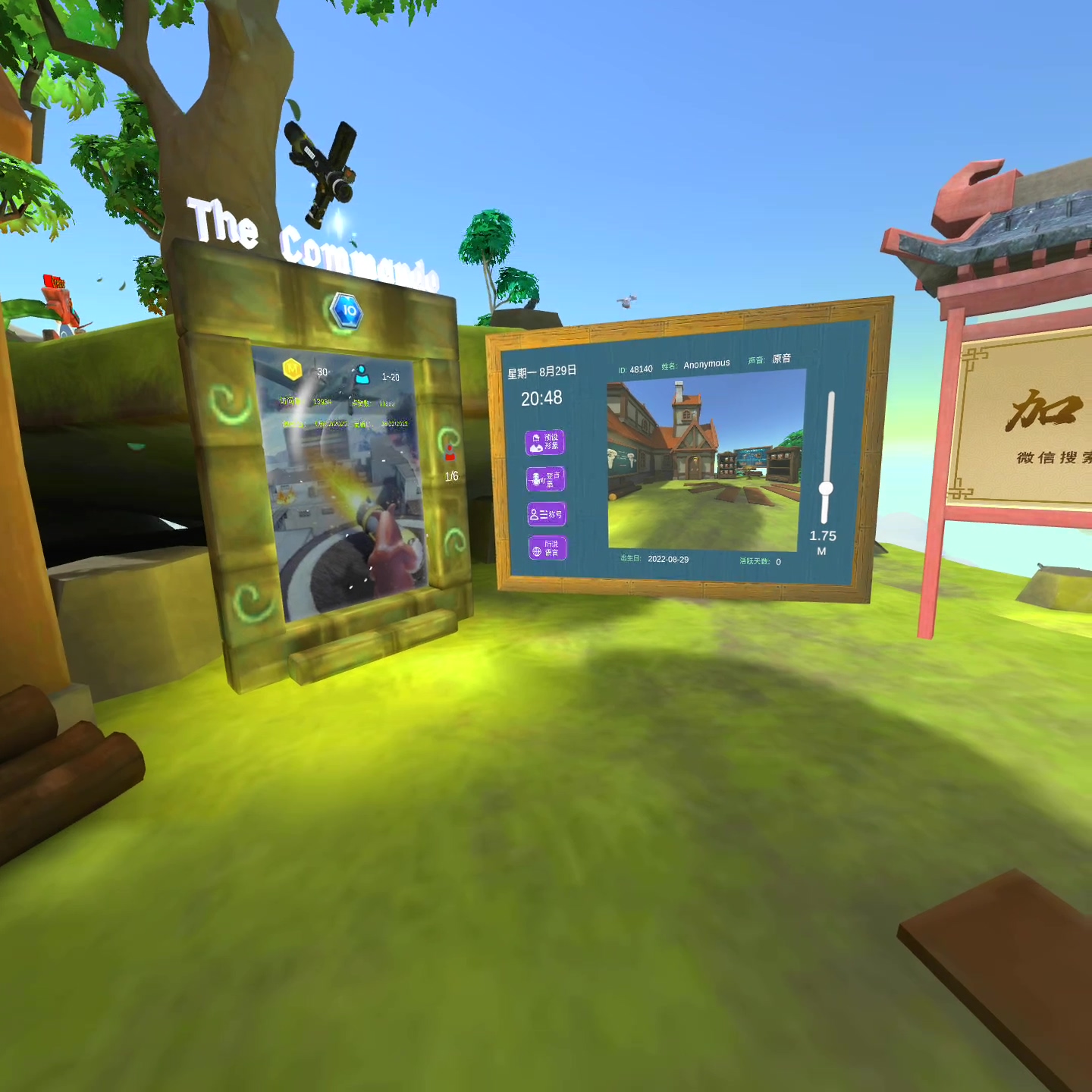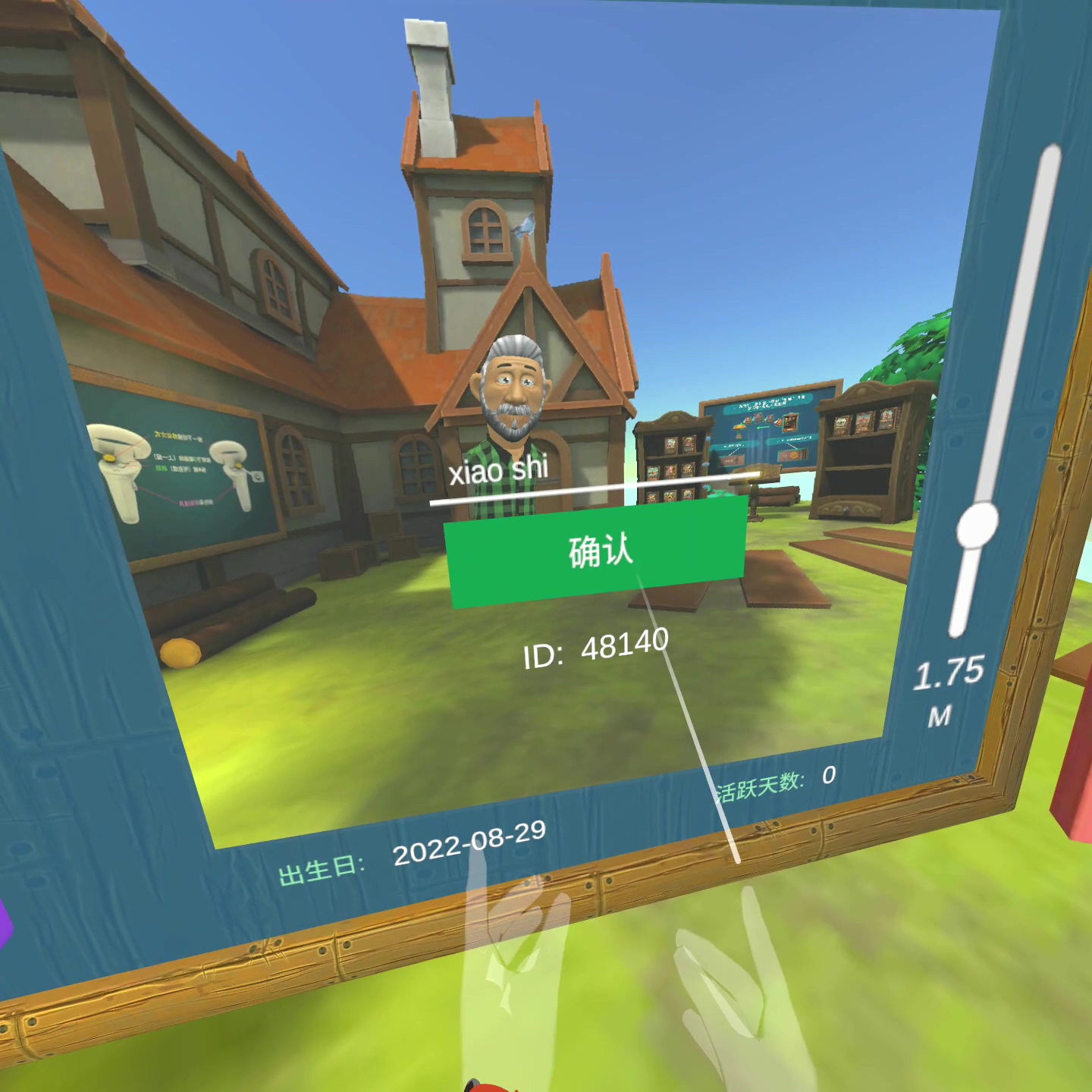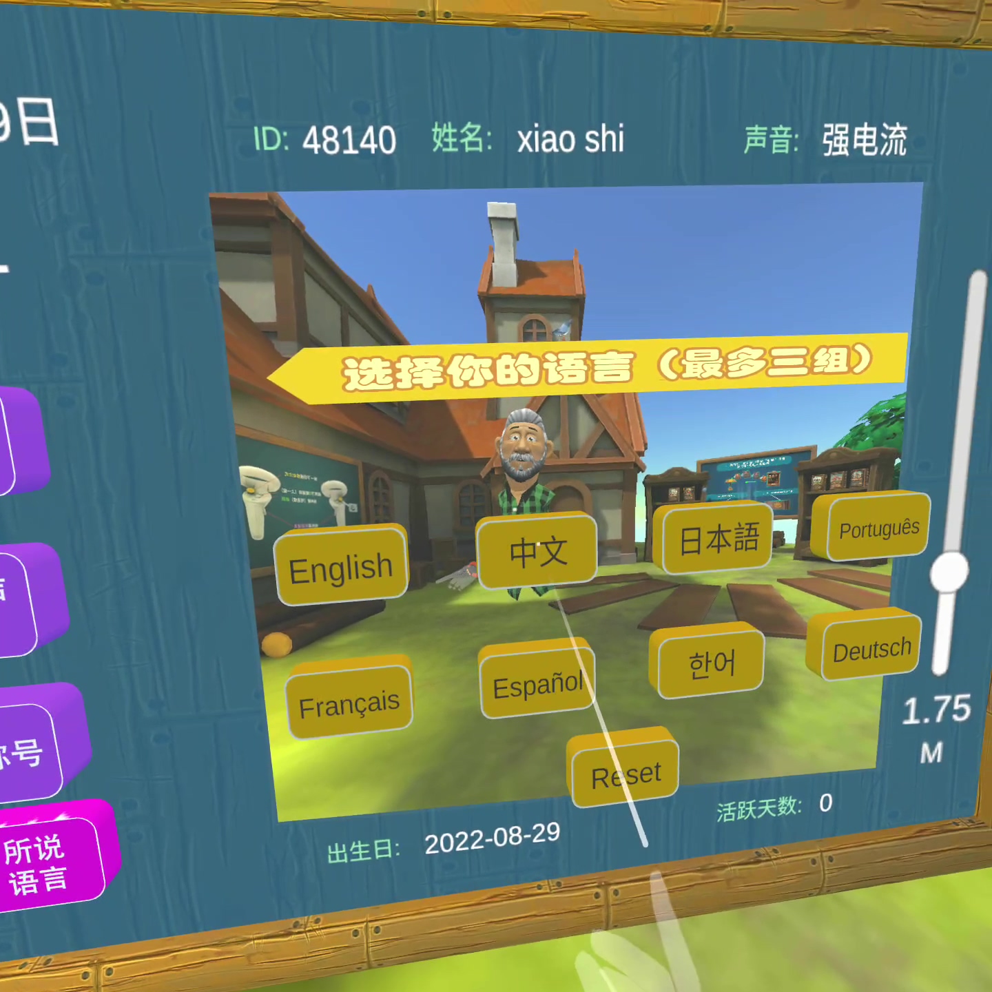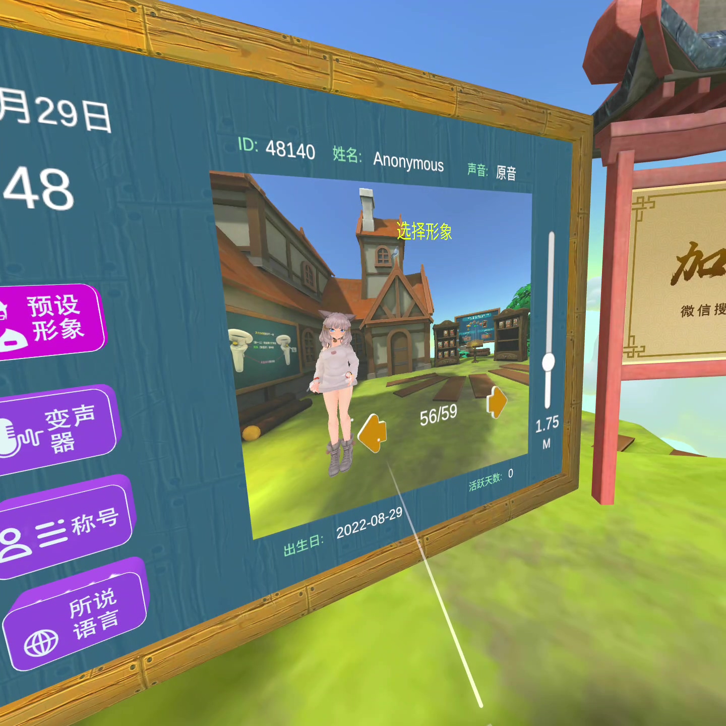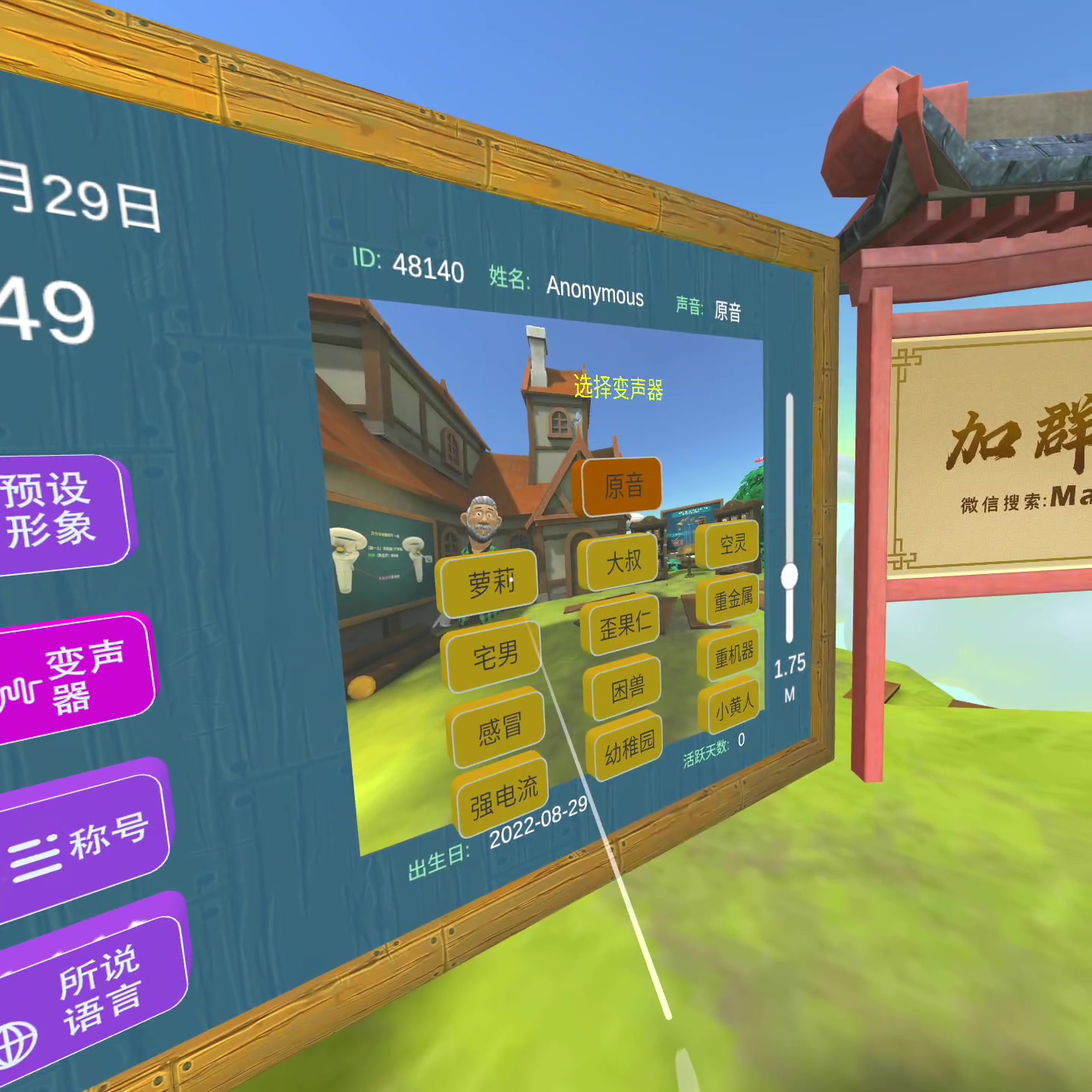 小屋的场景包括游戏设定,可以对自我形象、游戏内声音、称号、语言、身高进行设定: