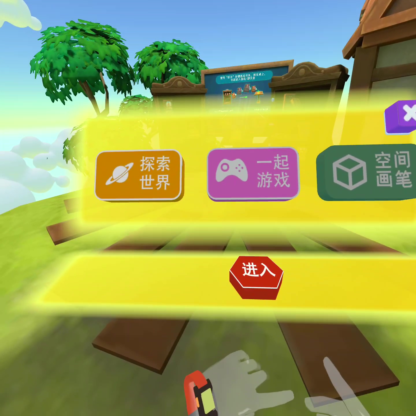 在小屋内按下调出左手手环,可以选择进入其他空间,分别是探索世界、一起游戏、空间画笔。