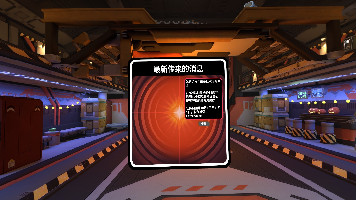 现在详细来说一下万圣节皮肤的收集任务,这个任务,只有在两种模式中有,“全模式”和“合作训练”,也就是我们以前说的排位和人机。新的竞技模式中是没有南瓜的,所以不用在里面找了。这个在刚进游戏的时候有消息说明,注意活动截止日期是11月1日。