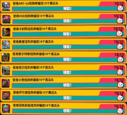 南瓜会在游戏地图中随机出现,用你操作的英雄打碎一个南瓜的话,本局游戏结束之后就会计数1。一局中可以多次打碎南瓜,也可以用不同的英雄去打碎,都会计数的。每个英雄打碎的次数上限是10,到了之后,就可以在每周挑战的地方去兑换皮肤了。