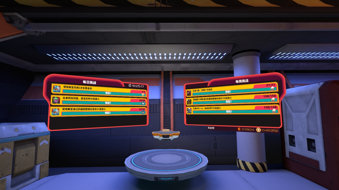 上一次更新后,每周任务这里多出了一些特殊挑战任务。由于我早就完成了,有点记不清了,记得第一个任务需要你在大厅里访问7个不同的地方。另外限时挑战任务推荐用卡利玛,击杀50人任务推荐用塔尔,这两个都需要在训练场完成。