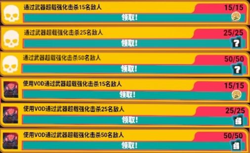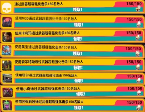 不同的英雄的武器超载强化后效果不同。但是有些不是很适合用来完成任务,比如小奇只是吸血可以吸取多人,美宝的超载飞行太慢。所以此时可以考虑使用副武器来完成超载强化任务。