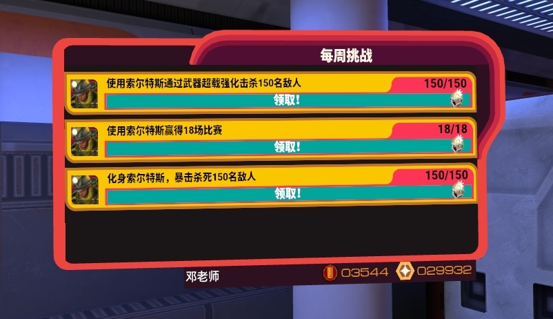 有时候,有些挑战可以一起完成。比如下图每周挑战,都是索尔特斯的任务,用她一个人就全部完成。