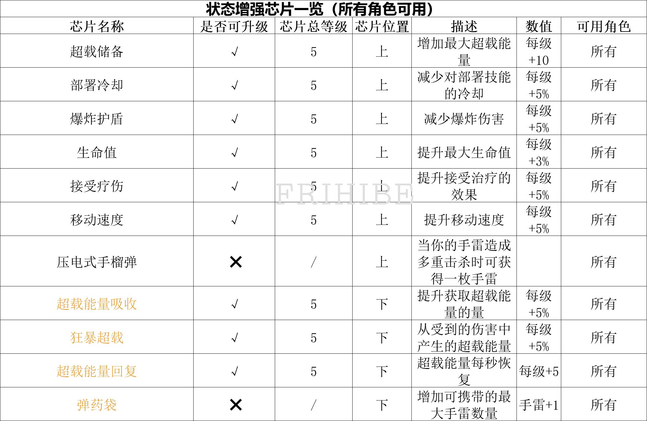 升级芯片是指可解锁的被动升级,可以配备专家负载。 通过解锁同一芯片的多个可以改善大多数芯片的效果。 有些芯片是角色独有的,而其他芯片(例如运动速度和血量)可用于多个不同的角色。 具有相同效果的芯片仍然是每个角色唯一的独特之处,因此您必须单独升级它们。