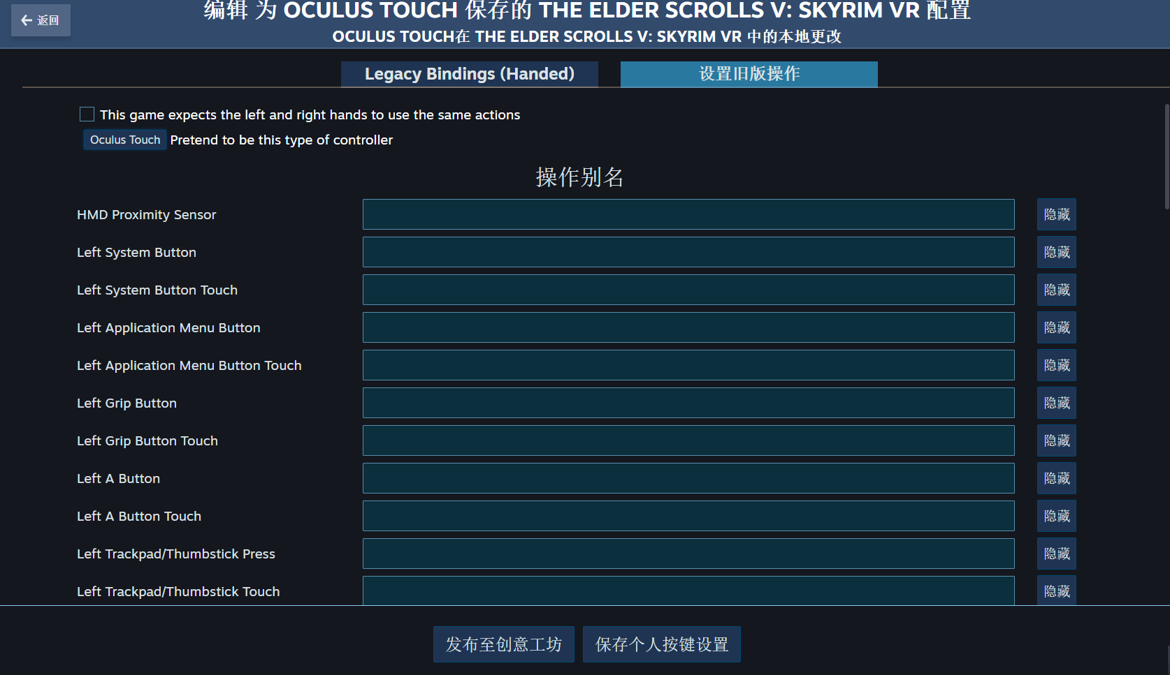 找到叫Legacy Binding(Handed)的窗口,选择设置旧版操作,点选第二条(初始是无)Pretend to be this type of controller,设置为 Oculus Touch。