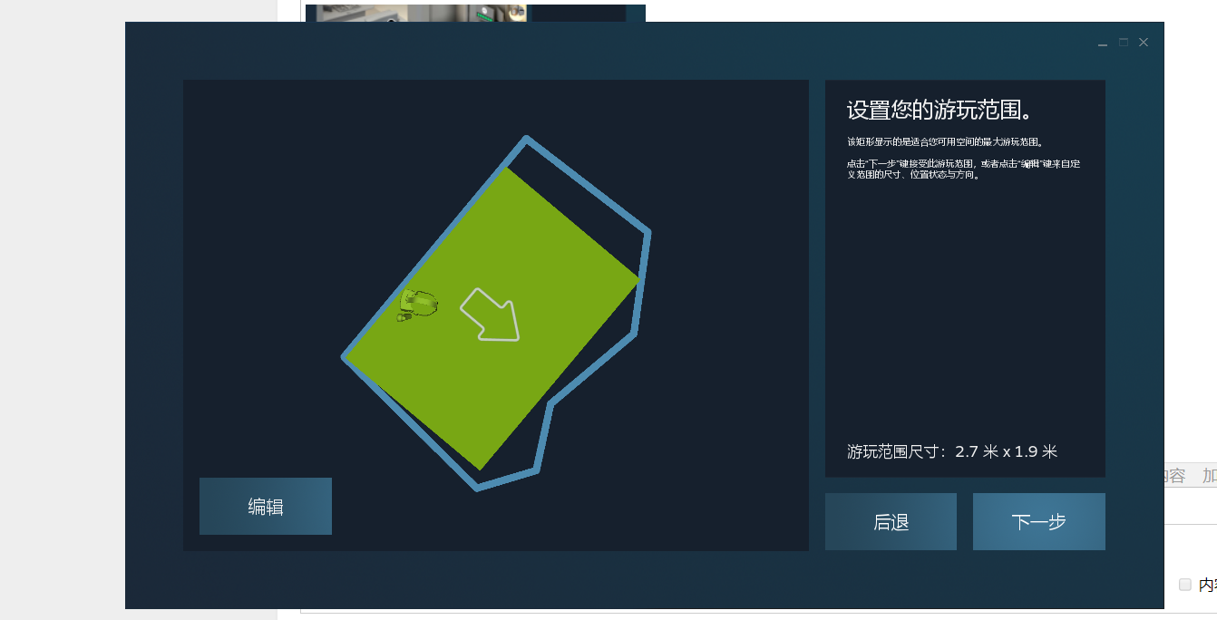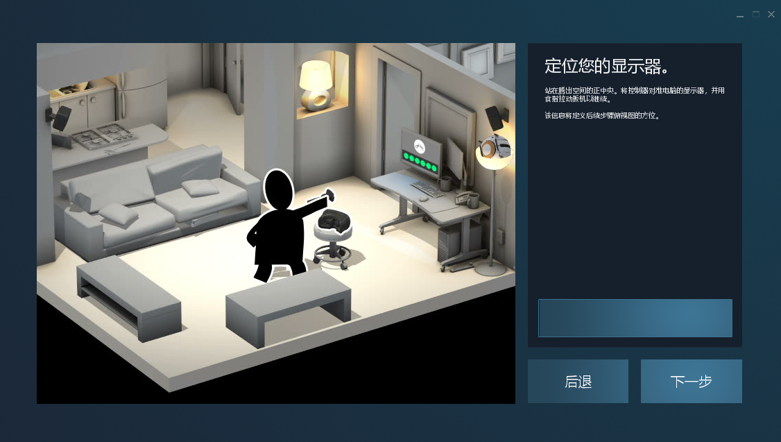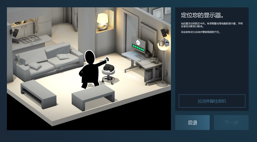 3、在地上按住一个手柄扳机键不放,直到微振动结束,steamVR出现下图,点击下一步。