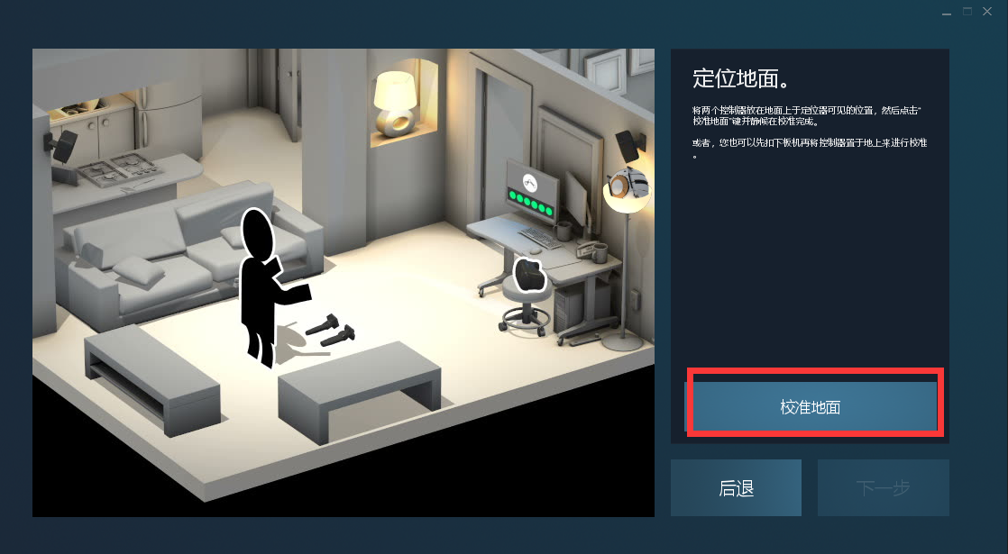 4、不要动Neo2,让它保持图2那样,点击steamVR房间设置的“校准地面”按钮,完成后点击下一步,再下一步