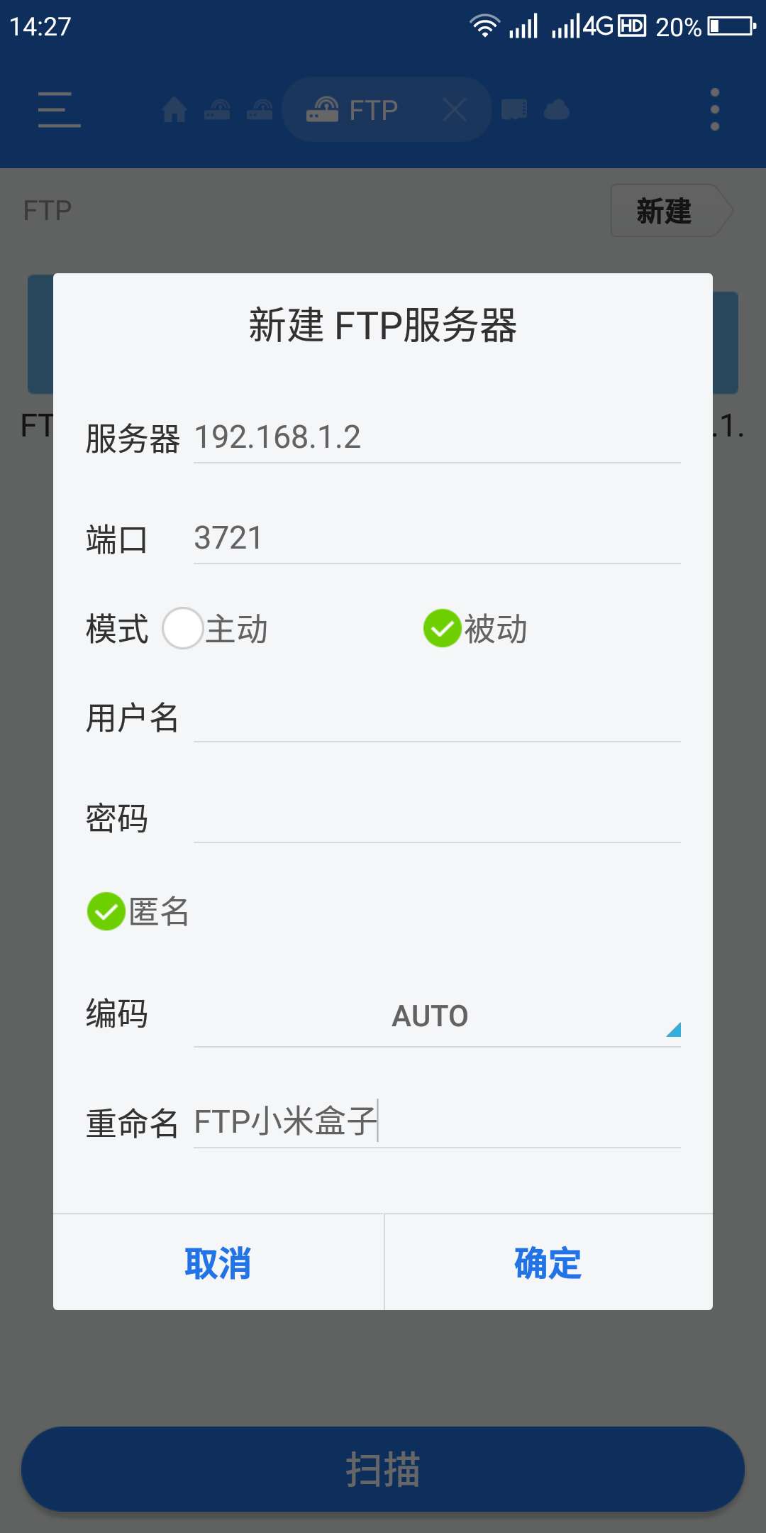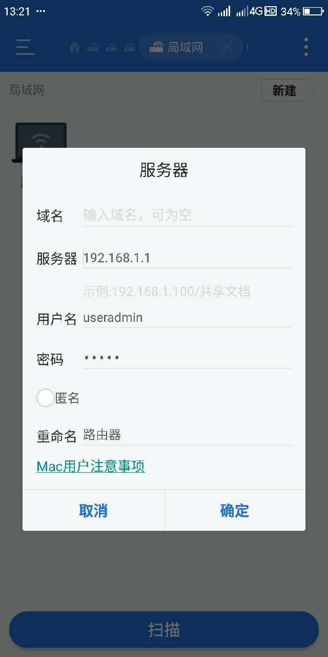 3. 打开Neo的ES文件浏览器,扫描,找到192.168.1.1 点击设置用户名和密码,但是这样有时候会连接不到服务器, 建议打开ES浏览器-局域网-新建-按如下配置